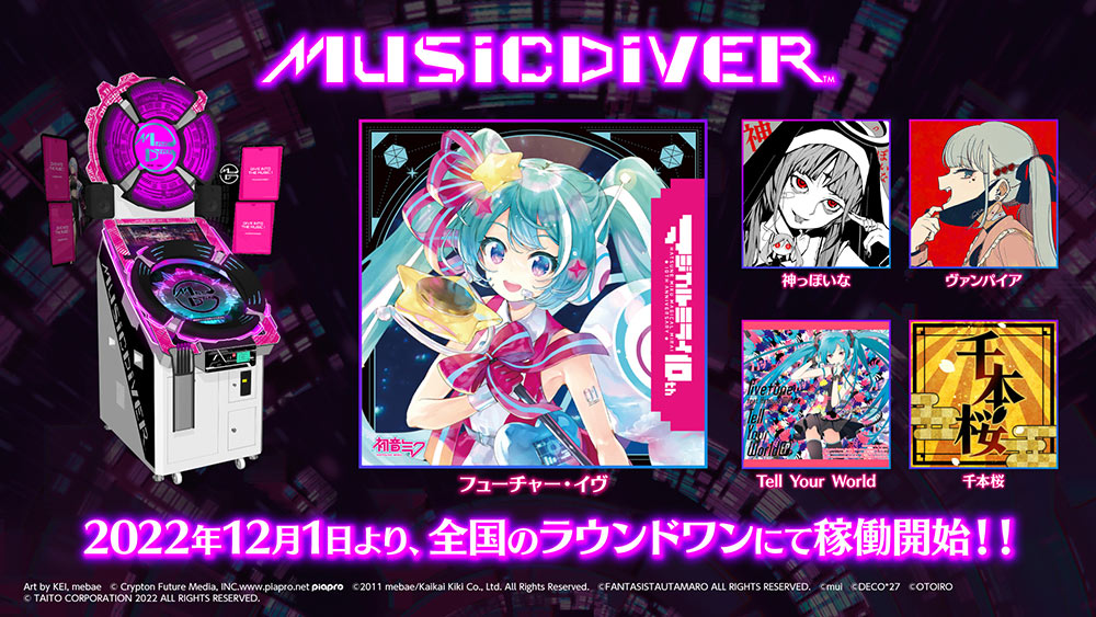 12月1日(木)より稼働を開始した新作アーケード用音楽体感演奏ゲーム『MUSIC DIVER』で、「マジカルミライ 10th」テーマソング「フューチャー・イヴ」をはじめとする、初音ミクの人気楽曲5曲がプレイ可能!
