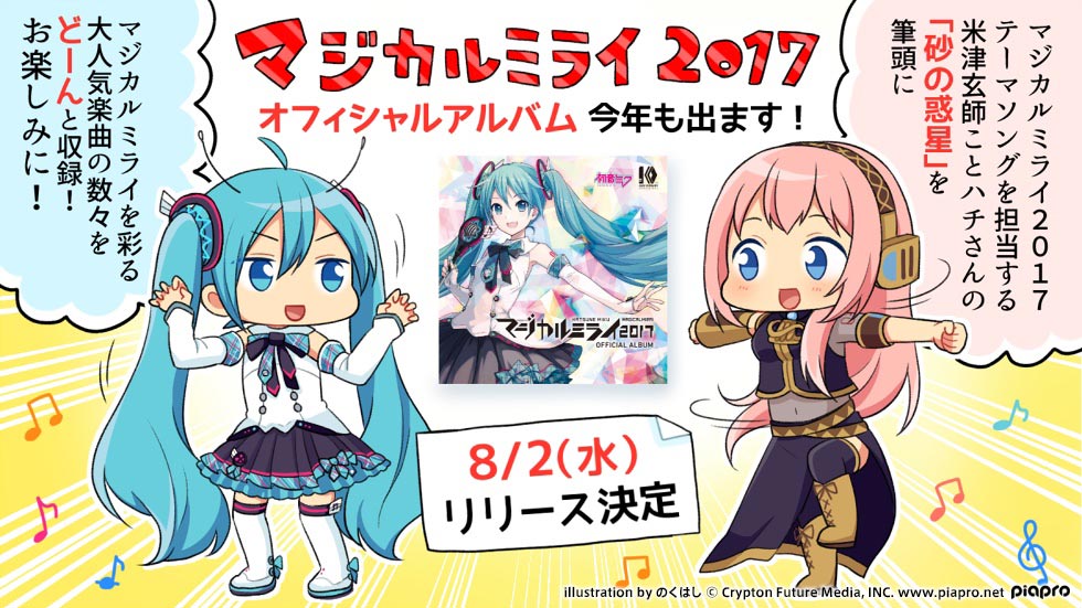 初音ミク「マジカルミライ 2017」のテーマソング「砂の惑星 / ハチ feat. 初音ミク」をはじめ、ライブパフォーマンスで披露される楽曲を収録したコンピレーションアルバムがリリース決定!