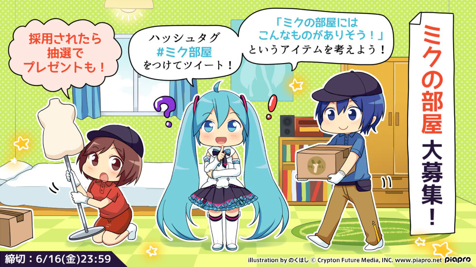 企画展に「みんなでつくるミクの部屋」が登場!「ミクのお部屋にはこんなものがありそう!」「あったらいいな!」というアイテムをTwitterで募集いたします!アイディアが採用された方の中から抽選で3名様に「初音ミクグッズ詰め合わせ」をプレゼント!たくさんのご応募をお待ちしています!